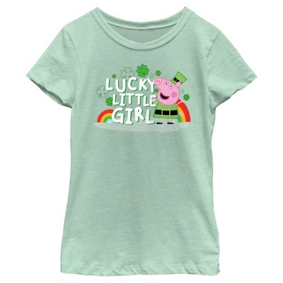 Don't get pinched for not wearing something green! Join Peppa and her family and friends for adventures, friendships, learning, and more, with fun festive officially licensed apparel for the whole family from the long-running British animated children's series Peppa Pig! This holiday-themed Peppa Pig George Lucky Little Boy Boys' Graphic T-Shirt features George Pig ready to celebrate St. Patrick's Day wearing green clothes with shamrocks and little rainbows surrounding him. Get your very own Peppa Pig tee today and get in on the fun!