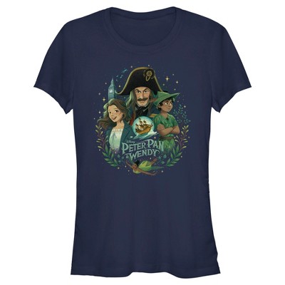 • Faith, trust, and Pixie dust come along with this stylish new boys' t-shirt featuring the movie's animated poster of Wendy, Captain Hook, Peter Pan, and Tinker Bell across the front.