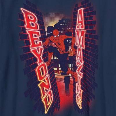 • Strut your stuff with this stylish new 60th anniversary boys' t-shirt that is perfect for this occasion! Featuring Spider-Man climbing walls surrounded by the city lights, alongside "Beyond Amazing" in neon lights style.