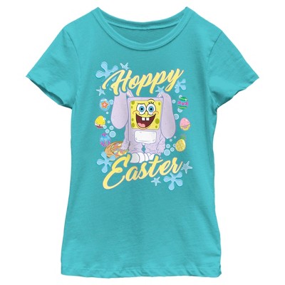 • Grab a basket and go on a hunt for this Easter boys' t-shirt! Featuring SpongeBob in a bunny costume along with text that says "Hoppy Easter."