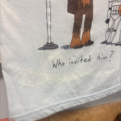 Overall cute shirt and it got the attention of Chewbacca at Disney. The printing isn’t very vibrant but you can still see what it looks like fine. He has only worn it a few times and it is holding up well. The shirt is boxy and a little stiff but I expected that