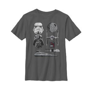 Even the bad guys can appreciate great fashion on the Star Wars Galactic Empire Essentials Charcoal Gray T-Shirt! This gray boy's Star Wars shirt shows off key elements and players in the Galactic Empire like the Death Star, Darth Vader, a Stormtrooper, and more across the front!