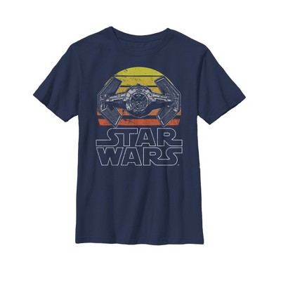 Take your Star Wars style in a retro direction with the Star Wars TIE Fighter Retro Navy Blue T-Shirt. A TIE Fighter is portrayed across the setting sun in a distressed retro-style print on this blue youth shirt with the Star Wars logo.