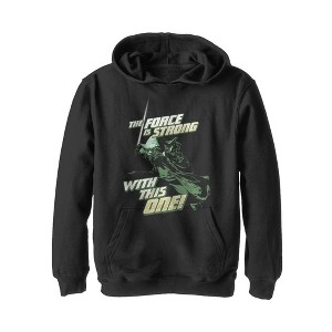 Yoda senses you have the Force, especially when you're wearing the Star Wars Yoda Force With This One Black Sweatshirt! This cool black Yoda boy's hoodie reads "The Force is Strong With this One" in ombre text alongside your favorite Jedi Master, Yoda, down the front.