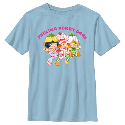• Strut your stuff with this stylish new boys' t-shirt that is perfect for every occasion! Featuring Strawberry Shortcake sitting on a strawberry with flowers, mushrooms, and a rainbow around her.