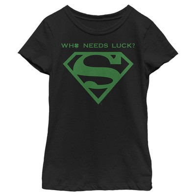 • This design features the words "Who Needs Luck?" with the iconic Superman logo in green!