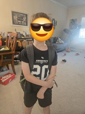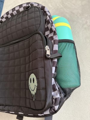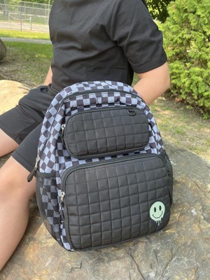 My 10 year old loves this. He likes the checkered pattern and smiley face. It comes with side pockets on both sides to hold water bottles. It has adjustable, padded straps. I like the 2 front pockets in the front. Also the name tag inside to label the bag.