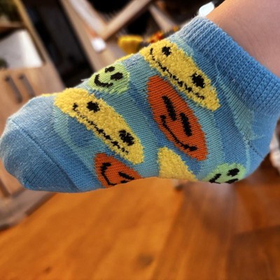 These socks are super cute and very soft! The smileys are almost flocked? Nice texture. My 5yr old loved the patterns & colors. Immediately wanted to put them all on at once, so enjoy that picture haha.