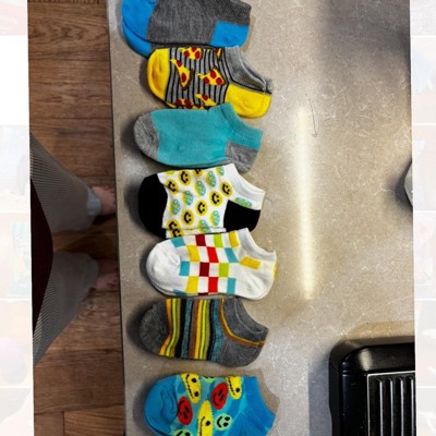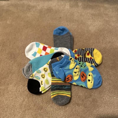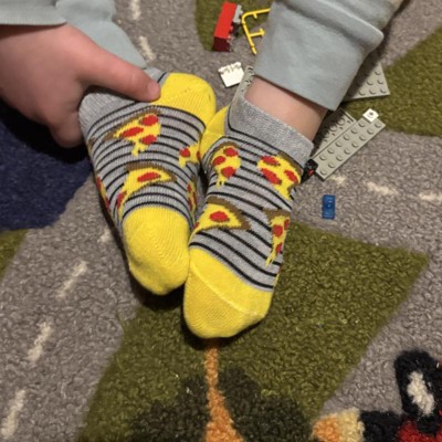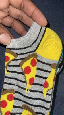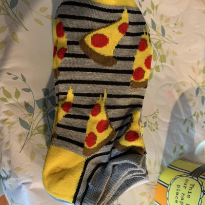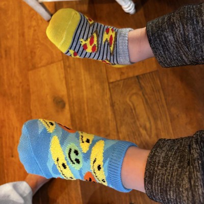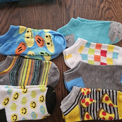 A: The socks feature playful designs like pizza slices, smiley faces, checkered patterns, and stripes.