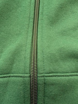 Bright forest green in color. Like your basic sweatshirt hoodie. Soft interior with a solid zipper. No drawstring on the hood. Switching is OK I just don't know how long it's gonna last from a durability standpoint.