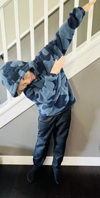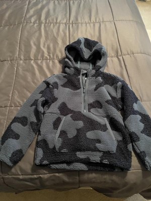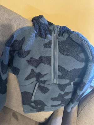 This boys high pile fleece quarter zip hoodie is cozy and practical. The fabric feels soft and absorbent which makes it great for wearing in light snow or rain. It is easy to pop on over clothes and adds just the right amount of warmth. The blue camouflage print is fun and eye catching and the thick plastic zipper feels sturdy and well made. A great choice for comfort and durability.