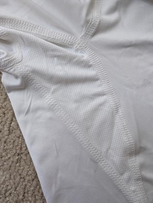 Lightweight boys white fitness shirt. The underarms have a nice mesh fabric for breathability. The white color is a bit see through, but for boys it shouldn't be a problem. Stitching seems OK, but I'm not sure how long it will last. This is definitely NOT durable stitching.
