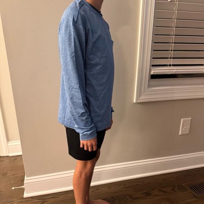 [This review was collected as part of a promotion.] My son is 8 and a bit short for his age with a slim build. He tried this top on in a size medium/8. It definitely ran quite big on him, especially in the length and in the sleeves. However, I really like the design and the material of the top. It feels light and breathable, making it a good choice to wear for sports and athletic activities. For my son it would work well to layer under his soccer jersey. I received an incentive to write this review.
