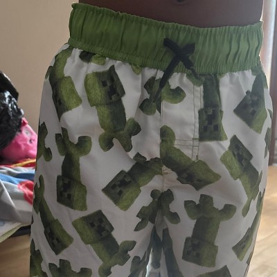 Infuse fun gaming flair into your child's swim wardrobe with these Minecraft Movie Art Swim Shorts. These mid-rise board shorts are made from polyester microfiber with a tagless design for comfortable wear. They boast a UPF 50+ rating for ample sun protection and a full elastic waistband with a drawstring for a snug fit. These pull-on shorts add blocky vibes to their beach style with allover light green Creeper character print on a white background.
