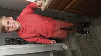 Have your child stand in front of the fridge.Mark the top of the head with a magnet. Measure a straight line from floor to magnet.