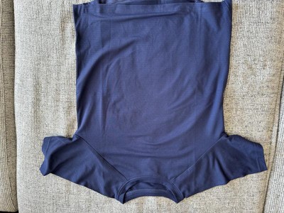 This navy blue T-shirt was made of a soft polyester material. It was breathable and rapidly dried. He has wore it a handful of times and it is pretty true to size. He is tall for his age and this was long enough but looked bulky on him. He liked that it was a solid color and was a uniform color so he could wear it to school. There is a pattern of lines every quarter of an inch throughout the shirt. This shirt looked great with his athletic pants but could also be used with some khakis.