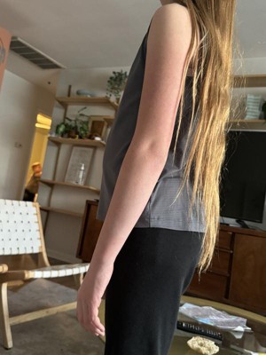 • A: The tank top has a regular fit and is designed to be below hip length.