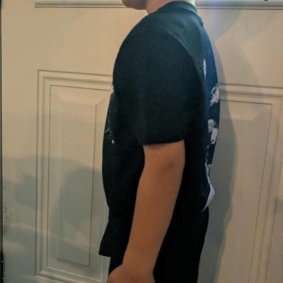 [This review was collected as part of a promotion.] My son is 5'7" tall and around 120 lbs and the XXL 18 in this shirt fit him perfectly. This black tee shirt has a small graphic on the front upper left that says "Gravity" and gives the definition. The back has a full size space scene. It's a pretty cool looking graphic tee. The quality is excellent. My son said it feels comfortable to wear. I highly recommend this tee for your space loving kid!
