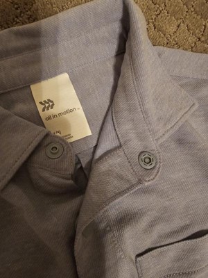 All In Motion Boys shirt has short sleeves. I like the big pocket and the cut of this shirt. The material is so soft and easy to wear. It is very stylish. It has a light blue color. It is flexible. It comes in medium size which is a good fit.