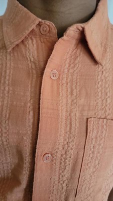 Nice bright color, perfect spring and summer vibes. Nice quality - not as "stiff" as some dress shirts can be, but our son would've loved a bit softer material for this textured shirt. Looks good and will be great for everything from nice dinners, celebrations, to casual outings.