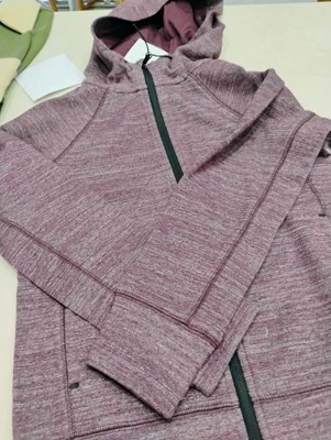 Very nice and well put-together hoodie. Lightweight material and purple, almost red-ish color. There is a mesh-like material on inside of the pockets and the hood. The rest is very soft. Comfortable and not too hot while running.