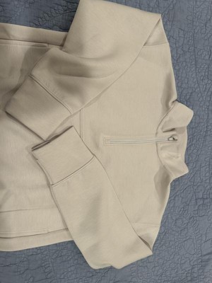 Spacer sweatshirt in a solid hue featuring a mock turtleneck with a quarter-length zippered front. Made from recycled polyester, rayon and spandex blend doubleknit fabric for all-day cozy comfort. It features a front pocket for stashing small everyday essentials, while the thumbholes help keep their hands warm.