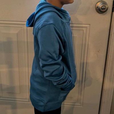 The Boys' Tech Fleece Pullover Hoodie from All In Motion in Fitness Gray color is neutral and modern, easily paired with various bottoms, and the overall fit is true to size.The material feel soft, lightweight tech fleece fabric, it provides warmth without bulk.The hoodie has a classic pullover design with a roomy kangaroo pocket, while the stretchy material allows for unrestricted movement, it a practical choice for my son everyday wear, he loves it.