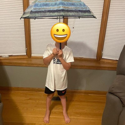 [This review was collected as part of a promotion.] My son is 3 years old and he is so excited to have his own umbrella. We love how cute the tie dye pattern is and he loves that it’s his favorite color…blue! The open and close function is absolutely amazing. It has a safety feature to save little fingers and is easy for kids to open up and close without help. No button needs to be pushed at all. Just push up when needed and pull down to close. We have already recommended this to so many people. I received an incentive to write this review.