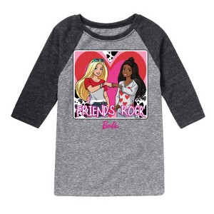 Barbie - Friends Rock - Toddler And Youth Raglan Graphic T-Shirt - Step into the glamorous pink world of Barbie with our officially licensed graphic garments for the fashion-forward! Whether you dream of being a fashion designer, a mermaid princess, or a world-traveling explorer, our garments bring Barbie's world to life with vibrant colors and playful prints. Crafted with quality materials and attention to detail, each piece ensures comfort and durability for all-day play. Express your unique sense of style and imagination with our exclusive Barbie graphic apparel!