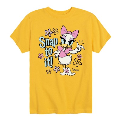 Disney - Daisy Duck - Snap To It - Youth Short Sleeve Graphic T-Shirt - Add a touch of magic to your wardrobe with this graphic apparel featuring iconic Disney designs. Showcasing beloved characters and classic imagery, each piece combines nostalgic charm with modern style—perfect for Disney fans of all ages. Whether you're headed to the parks or just adding whimsy to your everyday look, these graphics bring the magic to life.