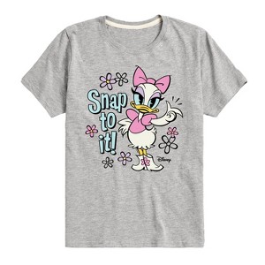 Disney - Daisy Duck - Snap To It - Youth Short Sleeve Graphic T-Shirt - Add a touch of magic to your wardrobe with this graphic apparel featuring iconic Disney designs. Showcasing beloved characters and classic imagery, each piece combines nostalgic charm with modern style—perfect for Disney fans of all ages. Whether you're headed to the parks or just adding whimsy to your everyday look, these graphics bring the magic to life.