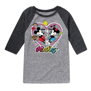 Mickey & Friends - Mickey Minnie Minkey - Toddler And Youth Raglan Graphic T-Shirt - Add a touch of magic to your wardrobe with this graphic apparel featuring iconic Disney designs. Showcasing beloved characters and classic imagery, each piece combines nostalgic charm with modern style—perfect for Disney fans of all ages. Whether you're headed to the parks or just adding whimsy to your everyday look, these graphics bring the magic to life.