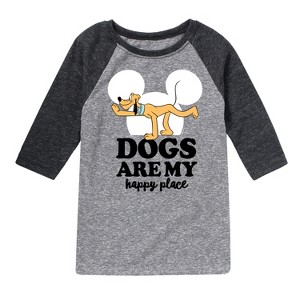 Mickey & Friends - Pluto Dogs Happy Place - Toddler And Youth Raglan Graphic T-Shirt - Add a touch of magic to your wardrobe with this graphic apparel featuring iconic Disney designs. Showcasing beloved characters and classic imagery, each piece combines nostalgic charm with modern style—perfect for Disney fans of all ages. Whether you're headed to the parks or just adding whimsy to your everyday look, these graphics bring the magic to life.