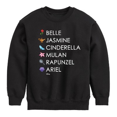 Disney Emoji - Princess List Icons - Toddler And Youth Crewneck Fleece Sweatshirt - Add a touch of magic to your wardrobe with this graphic apparel featuring iconic Disney designs. Showcasing beloved characters and classic imagery, each piece combines nostalgic charm with modern style—perfect for Disney fans of all ages. Whether you're headed to the parks or just adding whimsy to your everyday look, these graphics bring the magic to life.