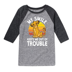 The Lion King - Simba - My Smile Keep Me Out of Trouble - Toddler & Youth Raglan Graphic T-Shirt - Add a touch of magic to your wardrobe with this graphic apparel featuring iconic Disney designs. Showcasing beloved characters and classic imagery, each piece combines nostalgic charm with modern style—perfect for Disney fans of all ages. Whether you're headed to the parks or just adding whimsy to your everyday look, these graphics bring the magic to life.