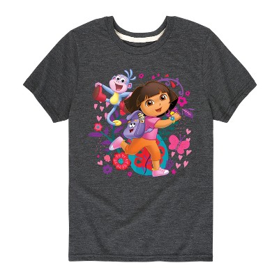 Dora The Explorer - Flowers And Butterflies - Toddler And Youth Short Sleeve Graphic T-Shirt - Bring adventure to your wardrobe with graphic apparel inspired by Dora the Explorer! Featuring bold colors, playful designs, and beloved characters like Dora, Boots, and Backpack, each piece captures the spirit of exploration and curiosity. Perfect for fans of all ages, this collection combines nostalgic charm with fun, eye-catching style for everyday adventures.