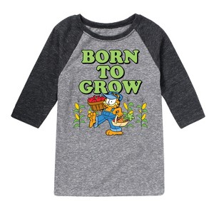 Garfield - Born To Grow - Toddler & Youth Raglan Graphic T-Shirt - Bring the humor and laziness of the famous orange cat to your wardrobe with Garfield graphic apparel. Featuring Garfield, Odie, and Jon, these designs celebrate the iconic comic strip and its beloved characters.