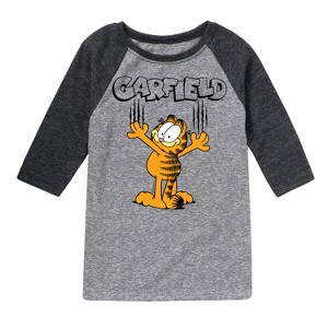 Garfield - Cat Scratches - Toddler & Youth Raglan Graphic T-Shirt - Bring the humor and laziness of the famous orange cat to your wardrobe with Garfield graphic apparel. Featuring Garfield, Odie, and Jon, these designs celebrate the iconic comic strip and its beloved characters.