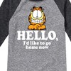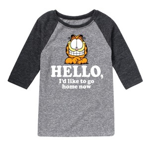 Garfield - Hello Go Home Now - Toddler And Youth Raglan Graphic T-Shirt - Bring the humor and laziness of the famous orange cat to your wardrobe with Garfield graphic apparel. Featuring Garfield, Odie, and Jon, these designs celebrate the iconic comic strip and its beloved characters.