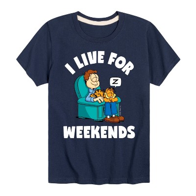 Garfield - I Live For Weekends - Toddler And Youth Long Sleeve Graphic T-Shirt - Bring the humor and laziness of the famous orange cat to your wardrobe with Garfield graphic apparel. Featuring Garfield, Odie, and Jon, these designs celebrate the iconic comic strip and its beloved characters.