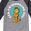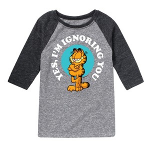 Garfield - Ignoring You - Toddler And Youth Raglan Graphic T-Shirt - Bring the humor and laziness of the famous orange cat to your wardrobe with Garfield graphic apparel. Featuring Garfield, Odie, and Jon, these designs celebrate the iconic comic strip and its beloved characters.