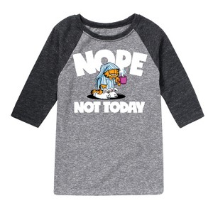 Garfield - Nope Not Today - Toddler & Youth Raglan Graphic T-Shirt - Bring the humor and laziness of the famous orange cat to your wardrobe with Garfield graphic apparel. Featuring Garfield, Odie, and Jon, these designs celebrate the iconic comic strip and its beloved characters.