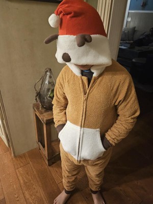 Transform your child into a cute reindeer during the holiday season by dressing them up in the Holiday Reindeer Union Suit from Cat & Jack™. This brown union suit features a hooded design with antlers and Santa hat on the hood for festive appeal. The dark brown, ribbed cuffs offer a snug fit and add a contrasting look while the kangaroo pocket helps provide space for small items. Made of 100% recycled polyester fleece fabric in a loose-fit cut, this hooded union suit helps keep them nice and warm. Plus, it's front half-length zipper allows for easy dressing and changing.