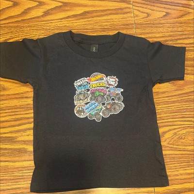 Hot Wheels - Monster Truck Stickers - Kids Toddler And Youth Short Sleeve Tee - Speed into bold style with Hot Wheels graphic apparel, featuring high-octane designs that showcase legendary cars like the Twin Mill, Bone Shaker, and other fan favorites. Each piece captures the adrenaline-pumping excitement of epic tracks, jaw-dropping stunts, and non-stop racing action. Perfect for fans of all ages who grew up launching cars off orange tracks and collecting miniature speed machines, this collection brings the thrill of Hot Wheels to your everyday look with energy, nostalgia, and unmistakable style.