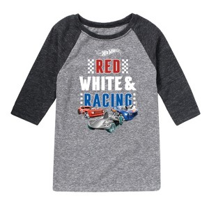 Hot Wheels - Red, White, and Racing - Toddler And Youth Raglan Graphic T-Shirt - Speed into bold style with Hot Wheels graphic apparel, featuring high-octane designs that showcase legendary cars like the Twin Mill, Bone Shaker, and other fan favorites. Each piece captures the adrenaline-pumping excitement of epic tracks, jaw-dropping stunts, and non-stop racing action. Perfect for fans of all ages who grew up launching cars off orange tracks and collecting miniature speed machines, this collection brings the thrill of Hot Wheels to your everyday look with energy, nostalgia, and unmistakable style.