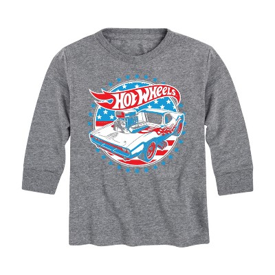 Hot Wheels - USA Stripes - Toddler And Youth Long Sleeve Graphic T-Shirt - Speed into bold style with Hot Wheels graphic apparel, featuring high-octane designs that showcase legendary cars like the Twin Mill, Bone Shaker, and other fan favorites. Each piece captures the adrenaline-pumping excitement of epic tracks, jaw-dropping stunts, and non-stop racing action. Perfect for fans of all ages who grew up launching cars off orange tracks and collecting miniature speed machines, this collection brings the thrill of Hot Wheels to your everyday look with energy, nostalgia, and unmistakable style.
