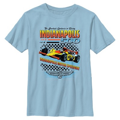 - You are sure to feel like a racing legend with this stylish new boys' t-shirt! Featuring a stunning retro artwork of a red race car and a pit crew performing a tire change, with "Indy 500" and the phrase "The Greatest Spectacle in Racing" printed in vibrant red and blue lettering across the front.