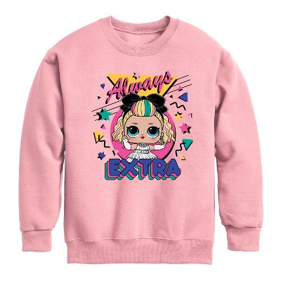 LOL Surprise! - Always Extra - Toddler And Youth Crewneck Fleece Sweatshirt - Dive into the world of glitter, glam, and surprises with our exclusive collection of apparel inspired by the beloved toy phenomenon, LOL Surprise! Dolls. Crafted with quality materials for comfort and durability, our Graphic Garments are perfect for expressing your unique style and spreading joy wherever you go. Whether you're uncovering the latest fashion trends or embracing the magic of surprise, our LOL Surprise! Dolls Graphic Garments are sure to add a touch of sparkle to your wardrobe. Get ready to unleash your inner diva and make a statement with our LOL Surprise!-inspired fashion today!