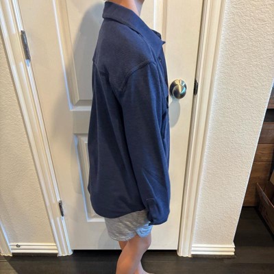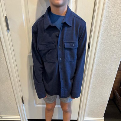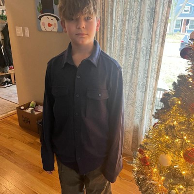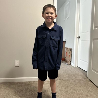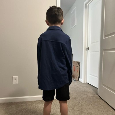 [This review was collected as part of a promotion.] Boys long sleeve button down shirt. Navy blue in color. Collared shirt. Buttons all the way down the front of her shirt. Very soft and comfortable material overall. My son is wearing size small or 6/7 in boys. My son is about 47 inches tall and about 54 pounds. This shirt can be worn for a casual day or dressed up for something more fancy. Overall great quality product.
