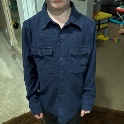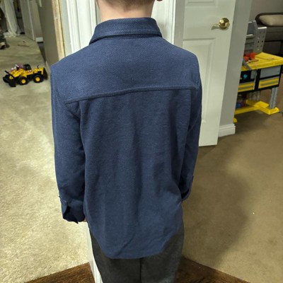 Keep your child comfortable and stylish in this Long-Sleeve Button-Down Shirt from Cat & Jack™. Made from soft jacquard-knit fabric with a recycled polyester-rayon blend and spandex, this button-down shirt offers a relaxed fit for all-day wear. The collared neckline, button-front design, and dual chest pockets give it a classic look, and it's great for wearing on its own or layering over tees.